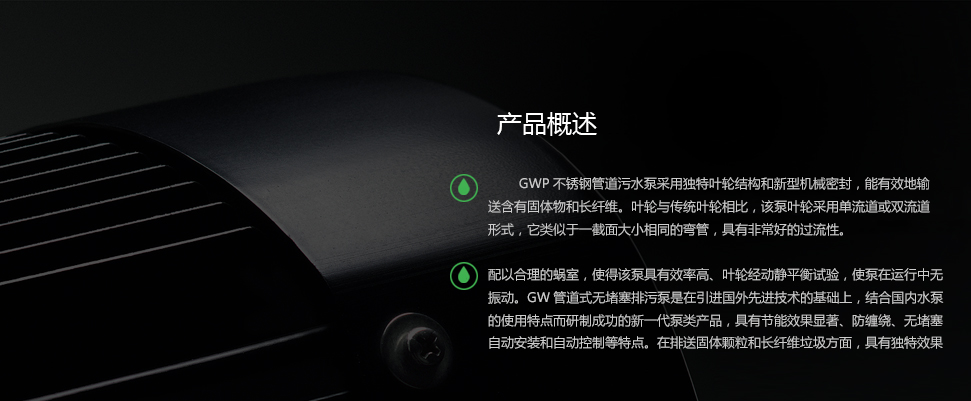 GWP不銹鋼無堵塞管道泵采用獨特葉輪結(jié)構(gòu)和新型機械密封,能有效地輸送含有固體物和長纖維。葉輪與傳統(tǒng)葉輪相比,該泵葉輪采用單流道或雙流道形式,它類似于一截面大小相同的彎管,具有非常好的過流性,配以合理的蝸室,使得該泵具有效率高