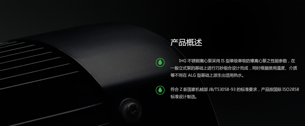 石一泵閥制造的立式IHG不銹鋼離心泵采用IS型單級單吸防爆離心泵之性能參數,立式IHG不銹鋼離心泵在一般立式泵的基礎上進行巧妙組合設計而成,同時根據使用溫度、介質等不同在ALG型基礎上派生出適用熱水、高溫耐腐蝕化工泵、油泵。該系列產品具有高效節能、噪音低、性能可靠等優點,符合Z新國家機械部JB/T53058-93的標準要求,產品按國際ISO2858標準設計制造。