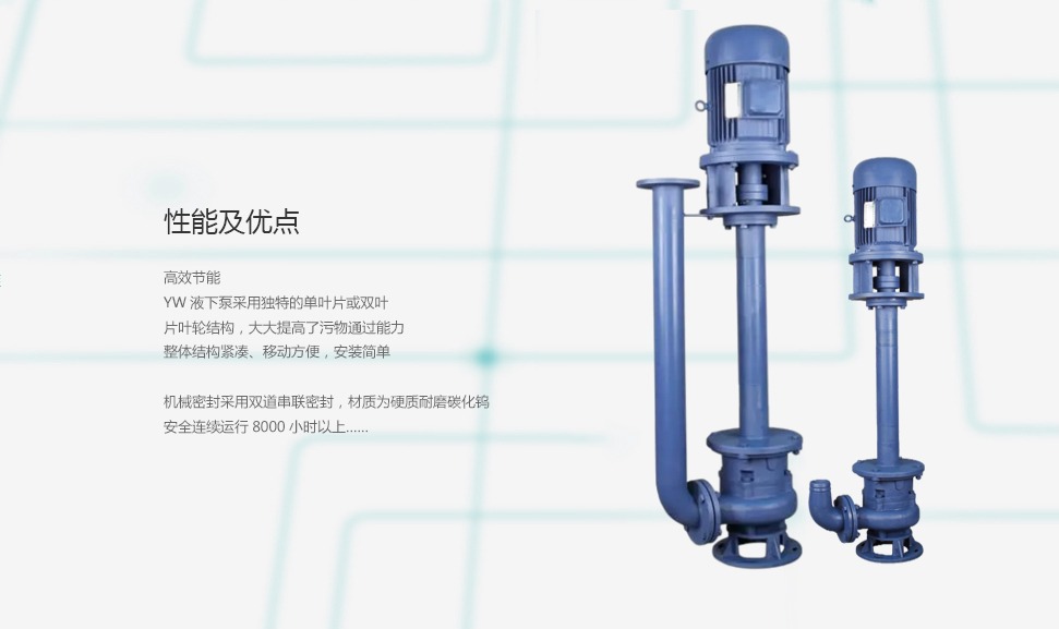 YW液下式系列排污泵是結合國內外先進技術的基礎上,液下泵的使用特點而研制成功的新一代液下排污泵產品,具有節能效果顯著、防纏繞、無堵塞等特點,在排送固體顆粒和長纖維垃圾方面具有獨特效果。