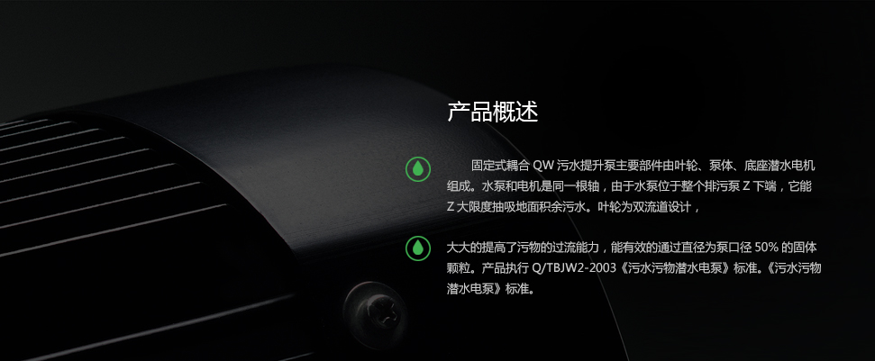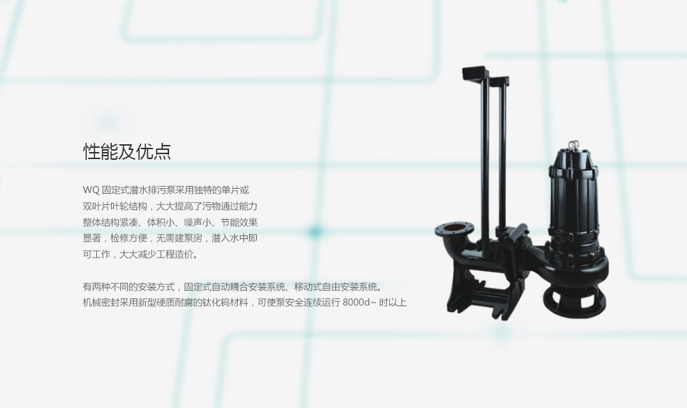 WQ固定式潛水排污泵使用于工廠商業嚴重污染廢水的排放、住宅區的污水排污站、城市污水處理廠排水系統、人防系統排水站、自來水廠的給水裝置